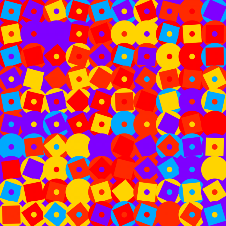 When starting this week’s exercise, I created a design system for myself out of a series of constraints chosen from the collaborative list made in class. My chosen constraints were 1) I could only use primitive shapes, 2) I had to make a pattern using those shapes, and 3) my colour palette was limited to 5 colours, and I could only use colours with maximum vibrance/saturation values. An additional constraint was that I could only use one software, which was my plan anyway. Jumping into Processing, I quickly wrote a sketch that would break up the screen into a grid, and draw *something* into every section of the grid, in sequence from left to right, top to bottom. I then played around with what was drawn in each grid segment, playing around with colours, shapes and sizes, using a combination of randomly assigned and hand coded values, to see what different outputs I could achieve..