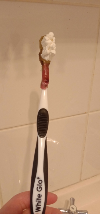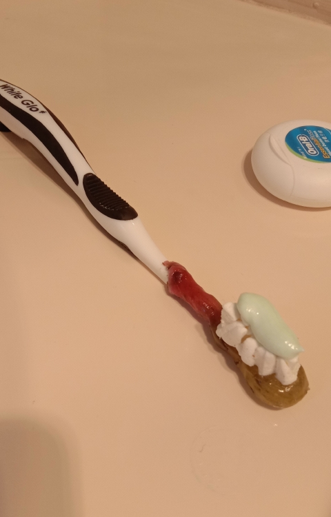 In response to the theme of found objects, I made a 'toothbrush' by using half an old toothbrush, melted boiled lollies and a chopped up marshmallow.