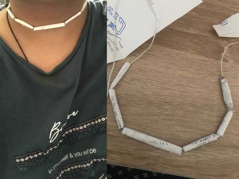 In response to the week’s theme of Found Objects, I made a choker necklace by using various shopping bills.