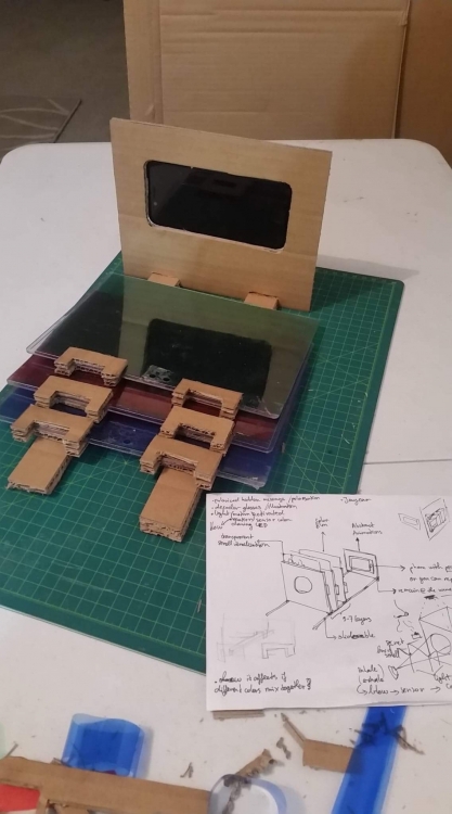 I'm using transparent films as an object to create this prototype. I'm putting my phone as a screen in the background with vary colors hidden among each other. Every time you change the color of the transparent film in front of the screen, it will reveal another message. At this stage, I'm using a simple image to test how it looks. I'm trying with animations as well.