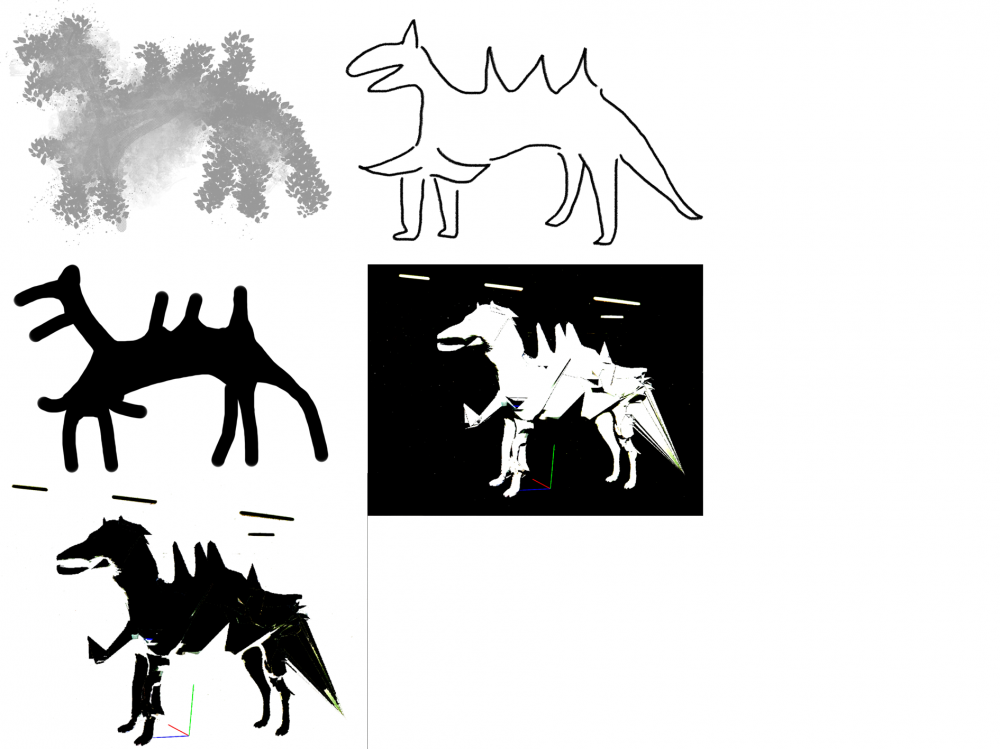I have never used Zbrush before, so I decided to try it without watching the tutorial video and see what I can do with it. I chose a dog model and try randoml brushes on it. It became a weird creature. I screenshot the creature, put it into photoshop and see what I can do with this alien dog. First, I created a new layer on the photo, and use the brushes I wouldn’t use before and draw on the new layer, trying to draw the figure of the alien dog. Second, I tried different brushes and draw. And then I changed the look of of the photo into black and white then I got something like Jurassic Park logo.