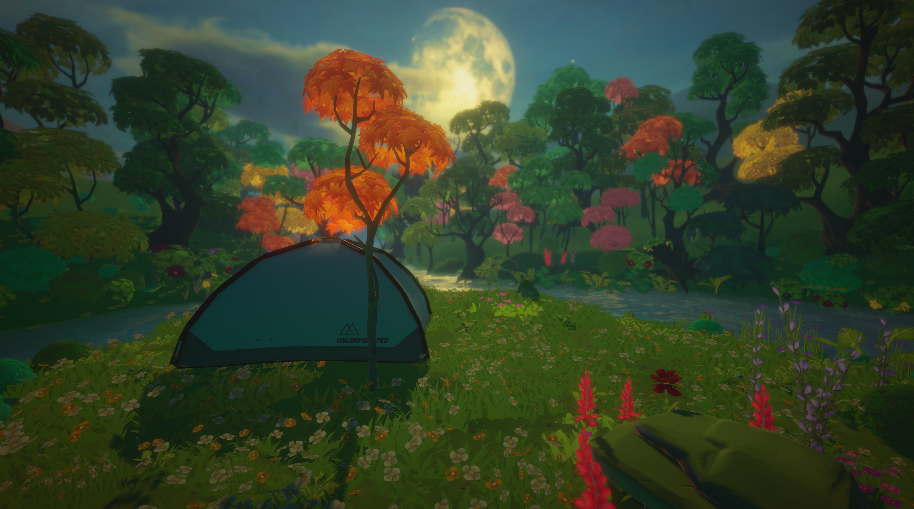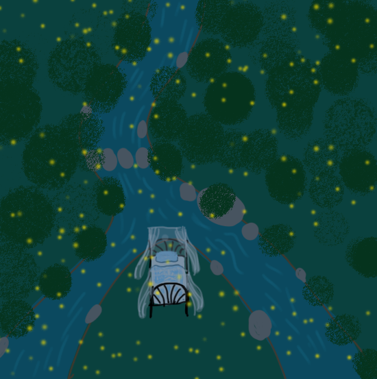 In response to the theme of Discussions of Place, I built a wide open space for meditation, relaxing and sleep, using Unity terrain tools and related 3D natural assets. By using unity assets such as water, trees, rocks and fireflies particles in this scene, I generated a quiet vibe especially for calming down and facilitating the processing of sleeping. Related work had been produced by Frank and Patrik Riklin, whose work Null Stern Hotel, 2016 explored this theme by placing a bed atop a Swiss mountain and charged visitors 250 Swiss francs per night to sleep under the sky. Artists promoted a "zero-star" concept through this installation and thought "the only star is you."