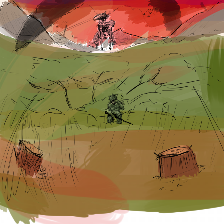 Through this work I have demonstrated the potential for dramatic, large scale scenes to depict nuanced insights into characters and uncover some truth about them through their surroundings. Camouflaged to blend in with the vegetation he becomes his environment, but more-so it is his identity and duty as a soldier that has defined the landscape around him. He is surrounded by flames and destruction, and a fiery, smoke-filled sky because he chose a life of violence. He adapts to his environment, and his environment adapts to him. Although a giant mechanical beast seems to be the antagonising force in this situation, both it and the soldier are one in the same, and exist in the same setting.