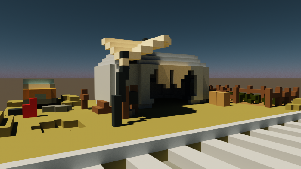 In response to the theme of Place, I've created a post-apocalyptic scene that consists of a shack near a train track with many objects around the shack to convey environmental storytelling using the voxel art software MagicaVoxel.