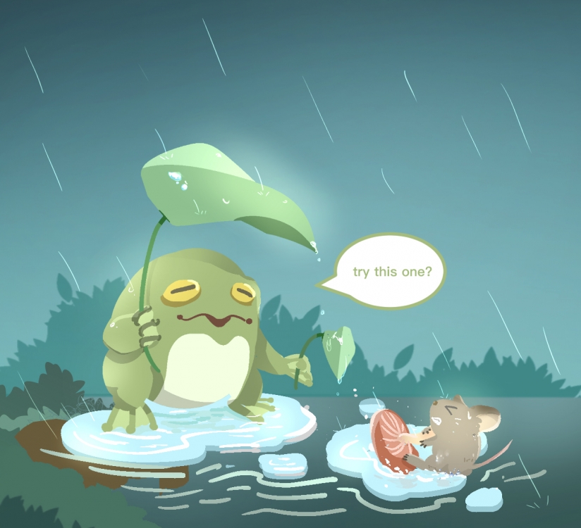 In response to the theme of Object Oriented Ontology, I created an illustration in cartoon style by Studio Paint. By showing the frog uses a leaf and the mouse uses a mushroom as umbrellas, I showed that without human use, the object would be a useful tool for animals. Similar work has been produced by Bill Mayer, who draws the animals as protagonists, using natural props to perform human actions.