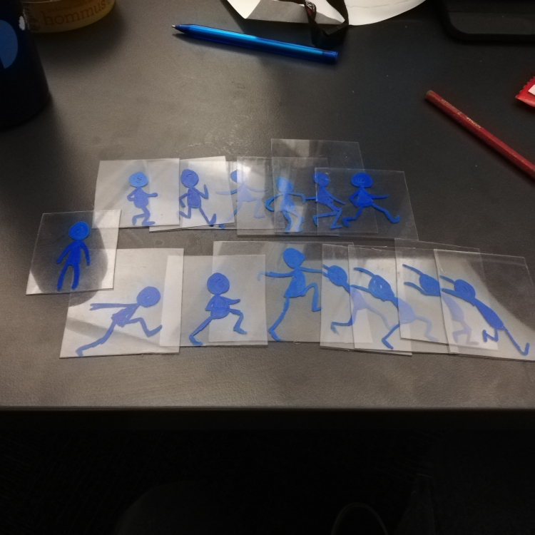 I used the materials that I ve been using in my studio 2 project the acetates to try and play with them and create a small interactive piece where I drew different walk cycles of a character, while looking in how to make a zoetrope and thinking, what happens if because of the timing of my actions will make the walking cycle go fast or slow depending on how fast or slow you move it will influence the timing and spacing in the piece. I drew the walking cycle in the acetates and cut them in little squares thought of manual zoetrope, like flip book, so I thought what happens if I just release the does squares from my hand to a surface and dependgind how fast or slow I release them will be the timing and spacing of the piece.