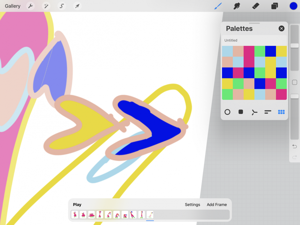 i took this little character and animated it as a goofy, bouncing creature. This exercise was really tricky and draining for me because in using Procreate to animate, especially with so many colours, I was technically challenged and found colouring frame by frame tedious