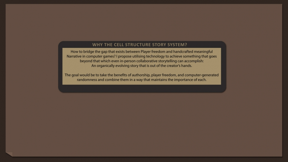 By expanding upon my earlier work with more diagrams and explanations about this concept, I have shown that a story structure is possible where event, environment and character have equal importance, feeding into one another to create more impactful organic storytelling. Here, storytelling is not a handcrafted experience, but rather a reaction to the flow of cause and effect and the relationship between every part of the game's world.