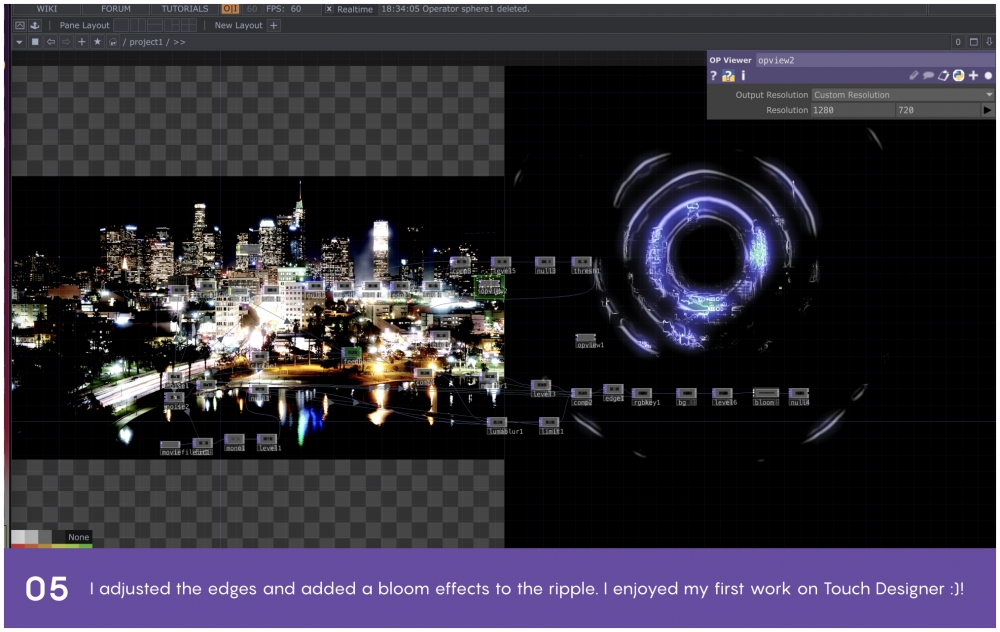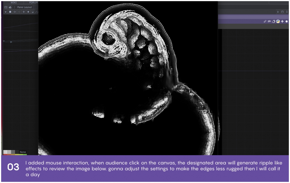 By tinkering different tools and parameters in TouchDesigner, I showed that the potential for digital imaging is beyond my imagination, it could be rendered realtime with interactive inputs. This has inspired me and would love to explore more in the future. Next step I would need to consolidate my knowledge towards the fundamental operation of TouchDesigner, especially the logics of different TOP and CHOP combination.
