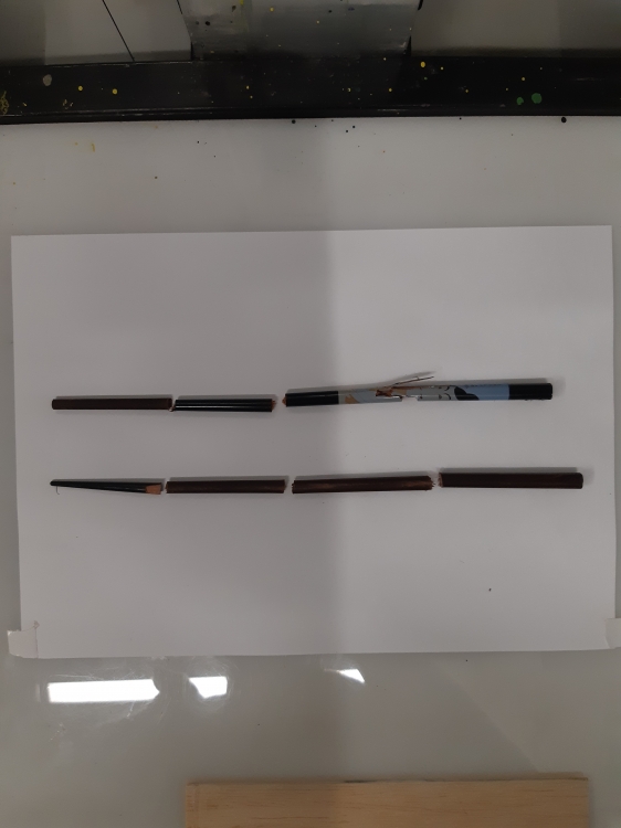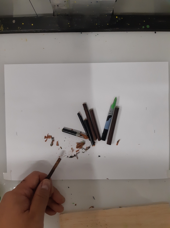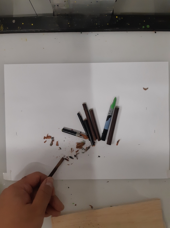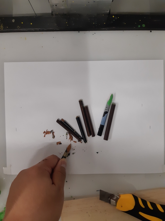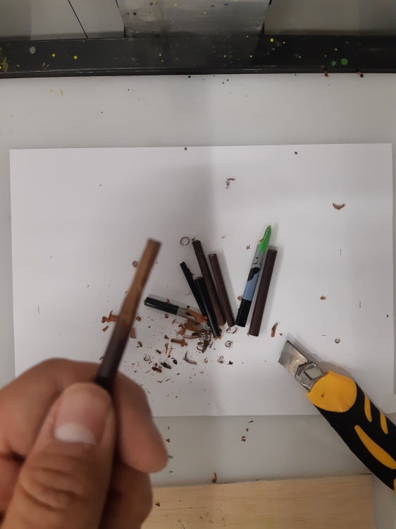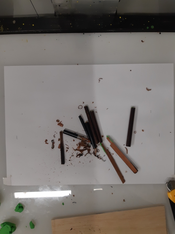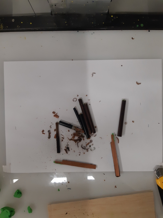 he studio doesn’t have a saw or anything that can cut through wood easily, I had to choose a blunt pencil knife and bash it with a iron rod(which is a substitution for a hammer).