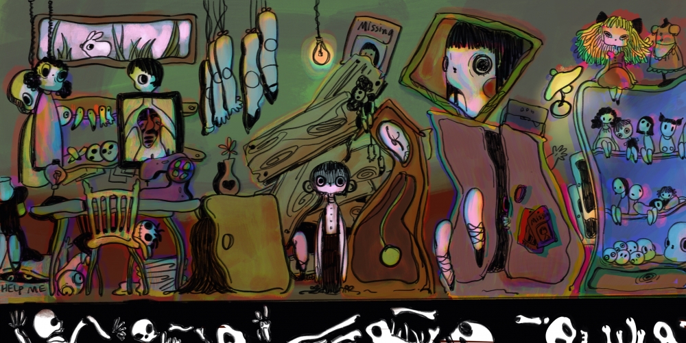 In response to the theme place, I use painting to show the atmosphere place I want to express. I want to design a very talented Puppet Master's home, a basement.