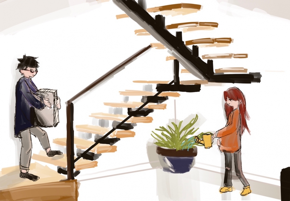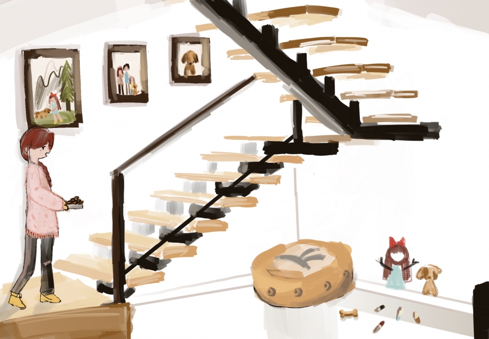 By drawing those two painting, I try to use some detailed part to show the changes rather than directly show the characters. Such as the painting on the wall, to remove the plants and put a kennel, the family photos next to the stairs. Both of them helps me to create a simple story. And I would like to use this to putted on my concept design for AGI Studio 1 work.