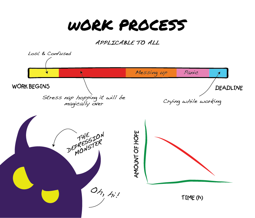 Inspired by my own stress and depression, I made a work process infographic hopefully to fill my hollow heart with a bit of delightful... humour.