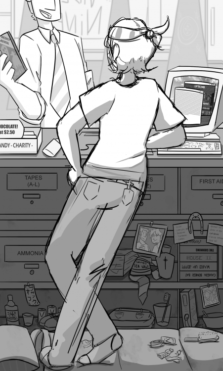 In order to make things easier on myself, I decided to base the scene around some characters I had previously used in my Studio 1 project. The gist of that game was that the protagonist's social life was being badly impacted by her job at a movie rental store, and the ghosts that were haunting her.