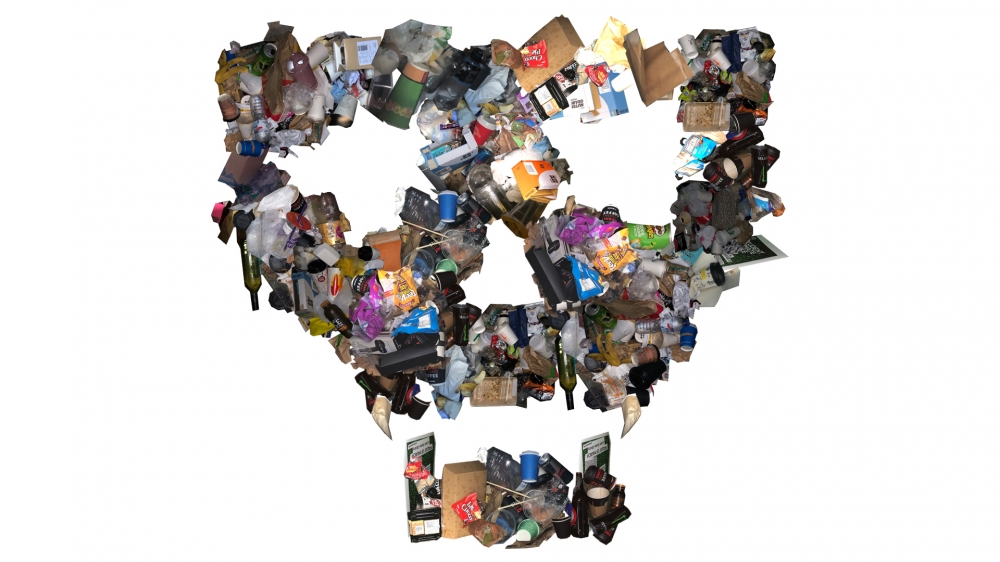 Tom Deining's self portrait, he make a self portrait through put different color of garbages in the right position.