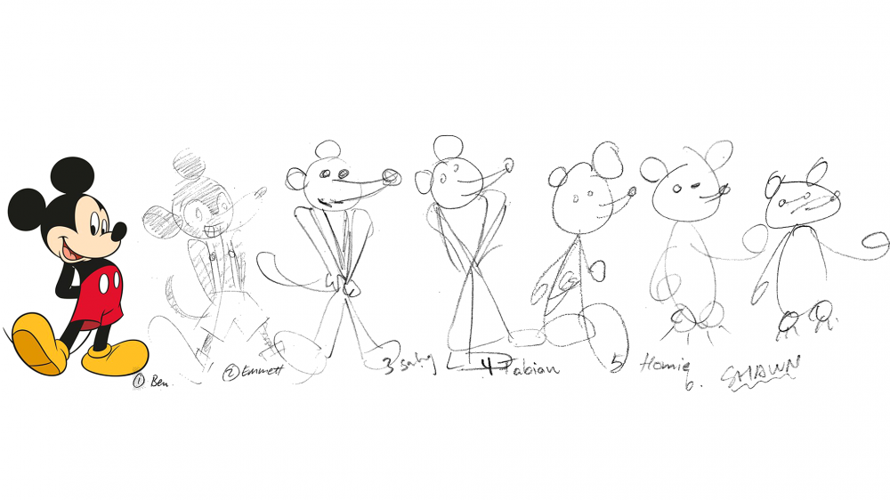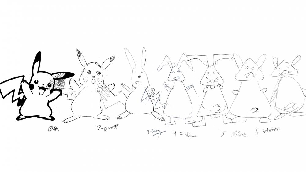 Randomly find six people to participate in this drawing experiment. The first person is given five seconds to redraw a famous cartoon character. Each subsequent participant has five seconds to memorise the previous person's drawing, and one minute to re-draw it. They don't get to see the original drawings other than the drawing immediately before them. Drawings are compiled together into a 'guess who' game, where the drawings are played out in reverse, and the audience is invited to guess the character.