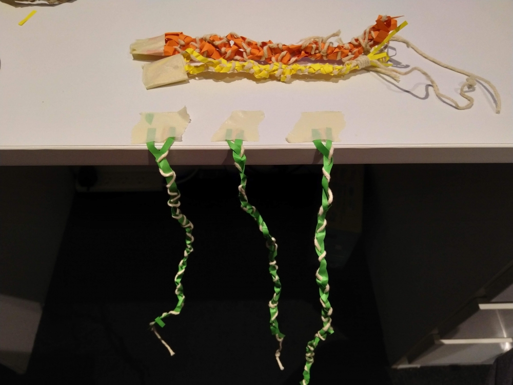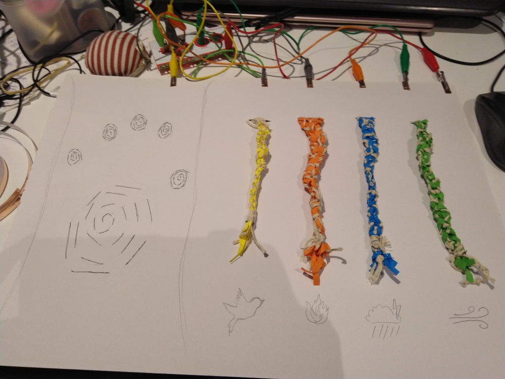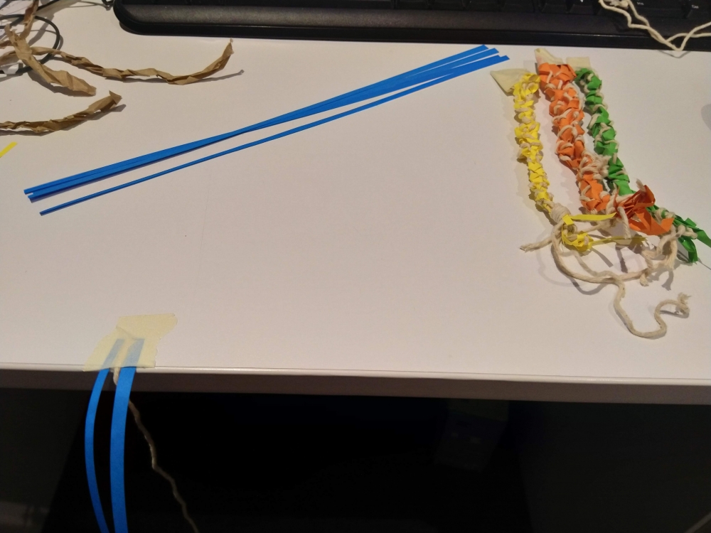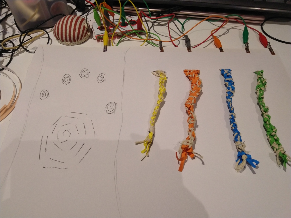 Created this proof of concept using a Makey Makey and Unity, to demonstrate the possible tactile interactions of Heartree (touching the tree trunk and holding onto the ropes to generate sound). Had to braid my own ropes from strips of coloured paper and leftover string from delivered parcels, as I couldn't go out to buy any materials due to the COVID-19 situation. I've ordered a bunch of materials online via eBay, but they have yet to arrive. The tree trunk interaction (hand) is activated using conductive thread.