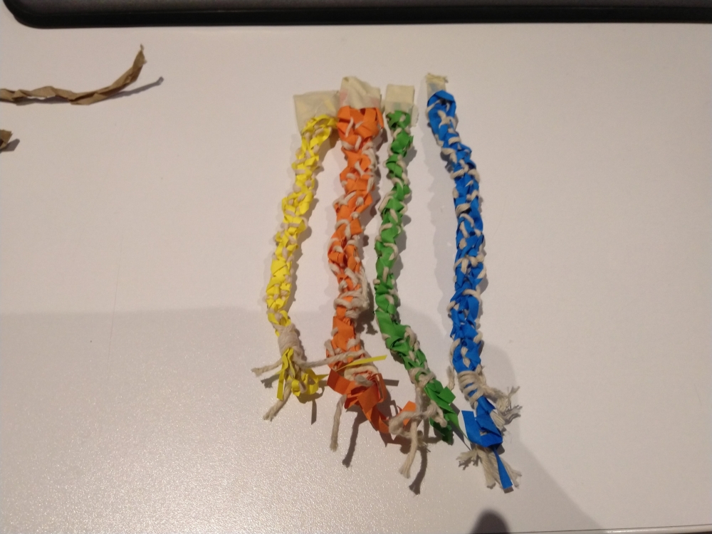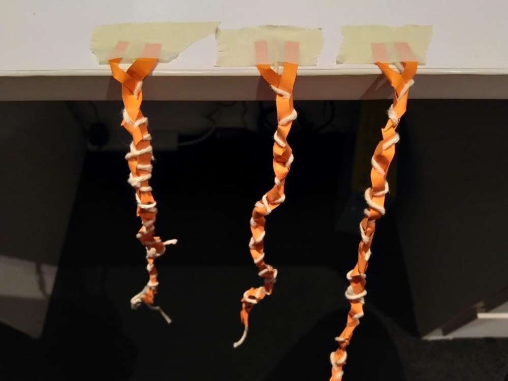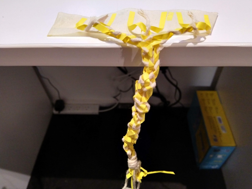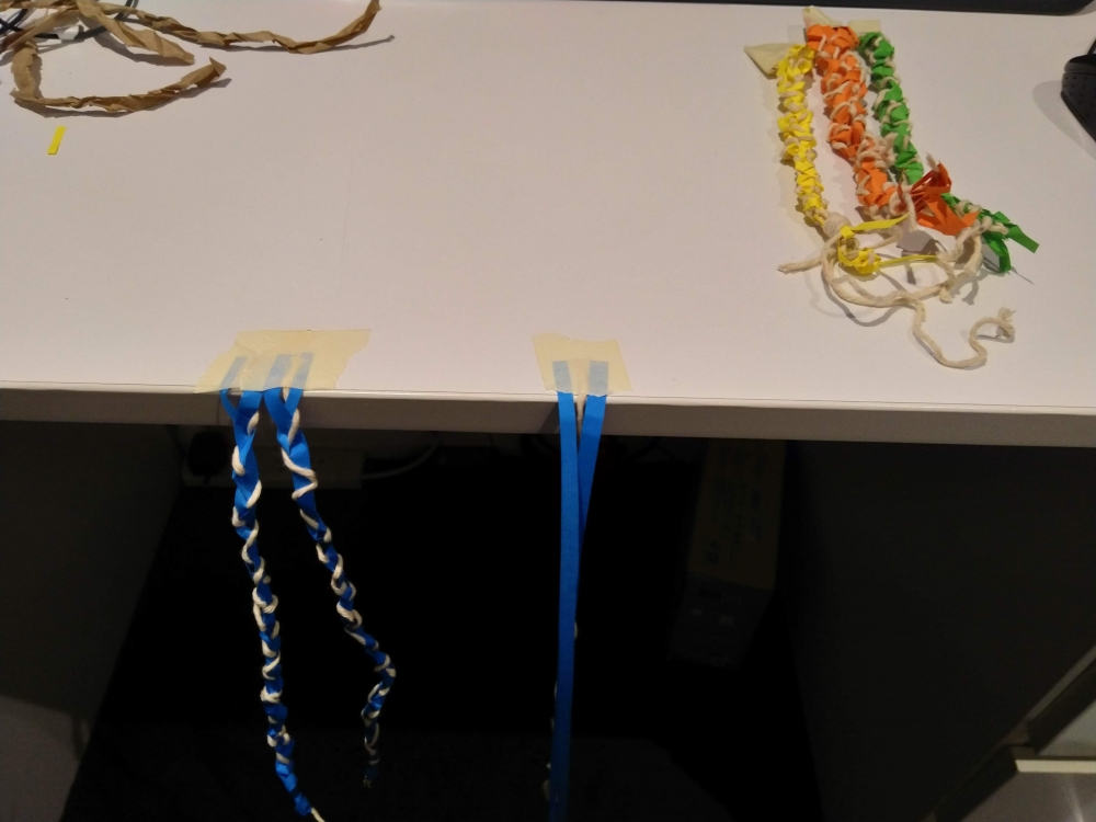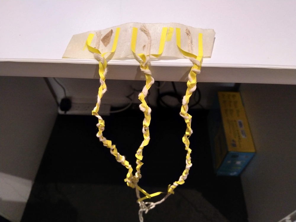 Created this proof of concept using a Makey Makey and Unity, to demonstrate the possible tactile interactions of Heartree (touching the tree trunk and holding onto the ropes to generate sound). Had to braid my own ropes from strips of coloured paper and leftover string from delivered parcels, as I couldn't go out to buy any materials due to the COVID-19 situation. I've ordered a bunch of materials online via eBay, but they have yet to arrive. The tree trunk interaction (hand) is activated using conductive thread.