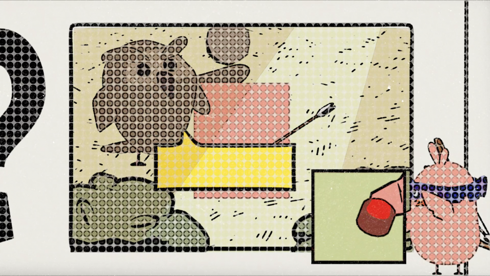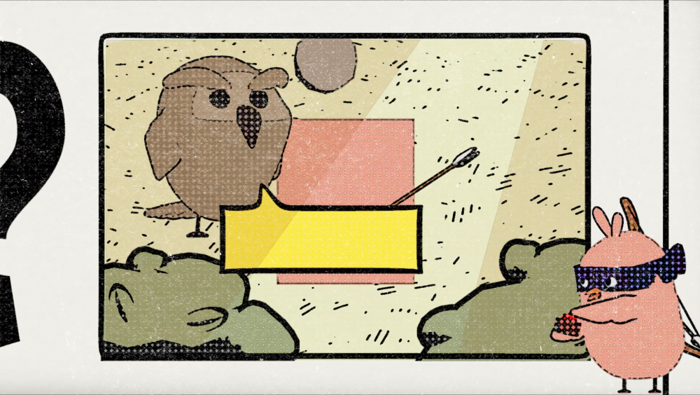 To create the unexpected while swiftly shifting the focus of the audience to the cock robin at the corner of the frame, I created a pop-up comic panel with an extreme CU of the cock robin’s wing with the button in hand. By using saturated colours and the movement of the background in the pop-up comic panel, I was able to relocate the audience’s focal point to the corner of the shot. I also tested out a few ways to pop up the comic panel, varying from masking to scaling. In addition to that, I applied a posterise time effect to that panel so it’s looking like it’s animated on 2’s.