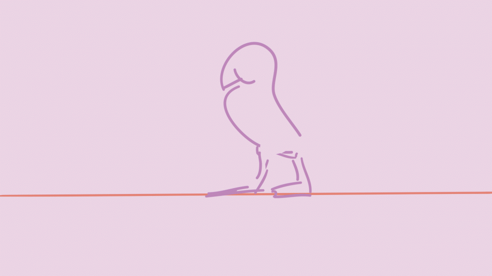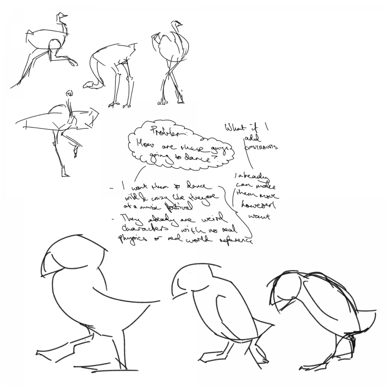 Taking a particularly goose-necked character, I decided to do animation studies of similar real life animals: an ostrich with its long, prehensile neck, and a puffin with its stiff, squat torso and flappy feet