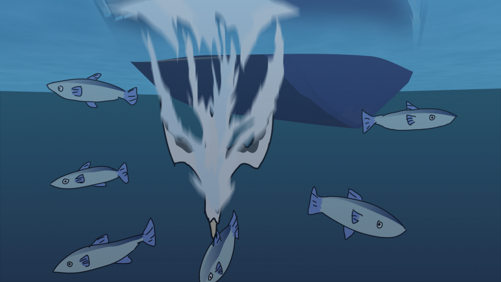 - For the experiment of the first project, there is a shot of seabirds jumping into the sea to catch fish in my animation. This shot is very suitable for pause processing. The action of birds jumping into the sea is a high-speed action. However, after entering the sea, the background of the shot is almost static, which can highlight the restless atmosphere. In this short animation, I made a distinction between the underwater atmosphere, realized it with dim colors, and animated the water spray into the water. As the water spray disappears, the picture tends to calm.