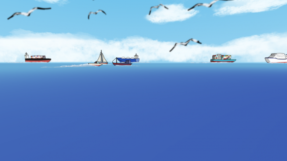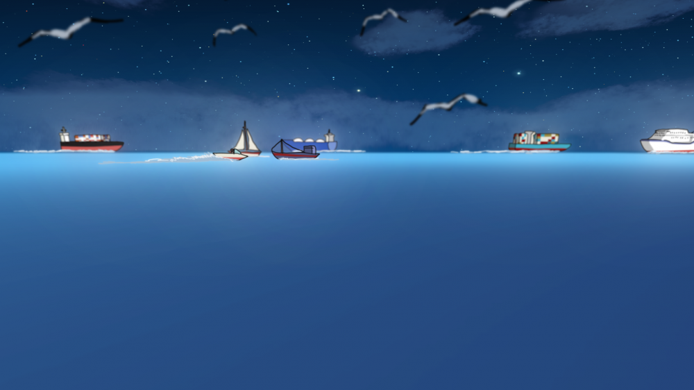 - The third scene is the scene of night navigation. I used gradient color filling for the background of this scene, and then used the effect plug-in of night sky to achieve the effect of the starry sky. I continued to retain the clouds used in the first scene, and filled the clouds with color effects. Then I adjusted the transparency and multiplication effects to get the current cloud effect. Then I used light processing on the sea and ships to make the sea more dreamy. Of course, in addition to these, other objects, including characters, have superimposed a fill layer on the layer to adjust to the atmosphere of night.