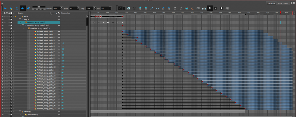 I used Harmony to hand-draw each frame of the ant cycle. After trying initially to draw all the legs at once, I realized I needed to break down the motion further. In the end, I did each leg individually before pegging them to the main ant body and creating a symbol from it.