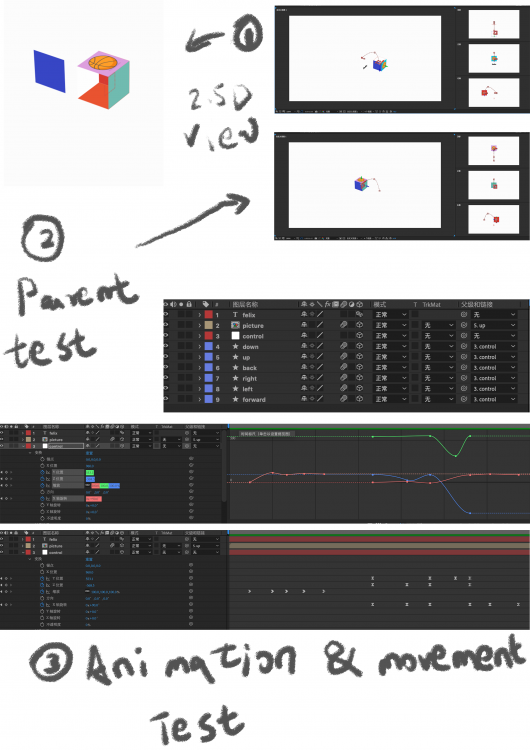 For AIM 02, I was trying to use the parent button to connect different sides of the square. Then made a null object for the parent. I can connect different sides and set key frame just for one file rather than set 6 sides of key frames. This could reduced amount of works. This is the main purpose of this step.