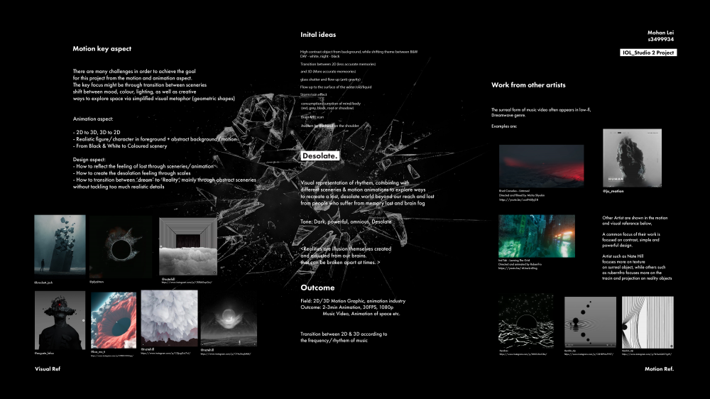 In Illusion of LIfe, I would be developing my studio 2 project: Desolate. A motion animation that describes and reflects a visual experience of people who suffer from brain fog/memory loss/flash backs.