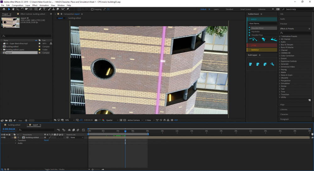 Method: Animate a still photograph taken outside the building based on a piece of music. I went with the Super Mario Theme because the nature of the bricks reminded me of the 8-bit video game tunes and MIDI songs. Super Mario had a well-known theme with a catchy melody that I thought would be easy to animate.