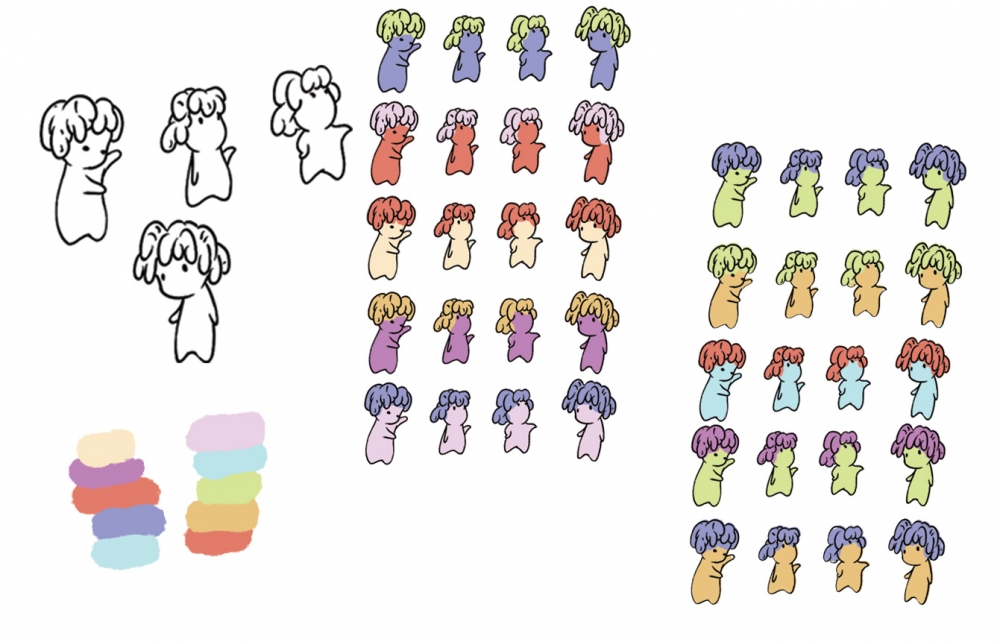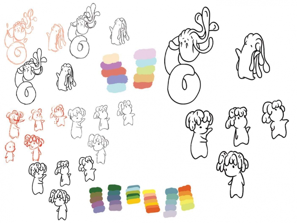 For my protagonist character, who I am calling Squish for now, I have 2 different version of what they will look like: a smaller, squat variation and a longer, elegant and wavy haired version as well. The reason why I have 2 versions of Squish is because in developing my idea aesthetically, firstly I realised I wanted to explore more fantasy ideas like fairytales and folklore. In doing so, I wanted to have a transformation of Squish from their everyday form into their 'magical' or 'ascended' form.