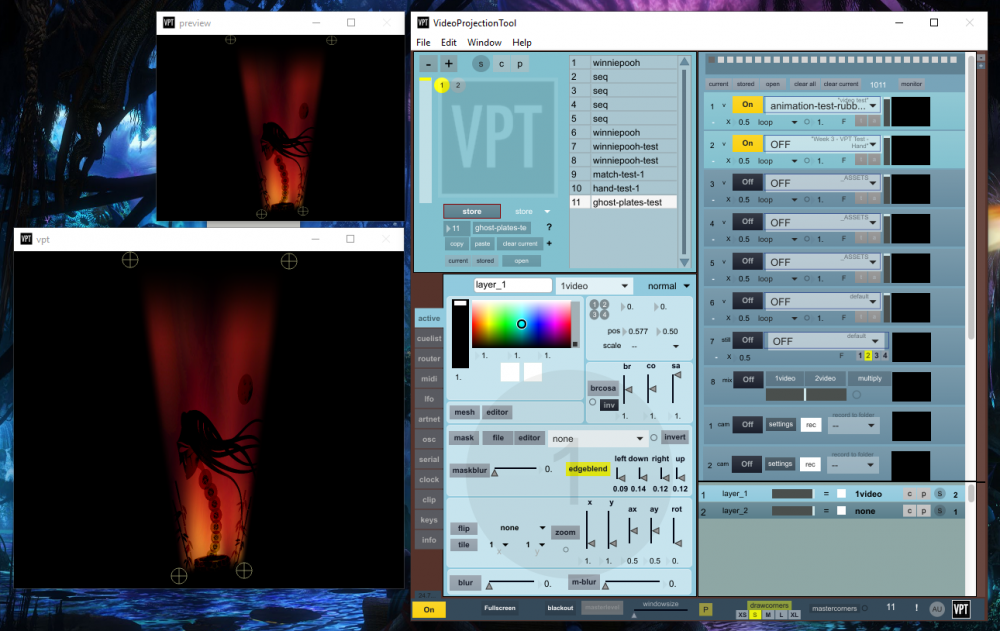 Quick projection mapping test of the rough animation I did back in Week 4 onto the wall behind an open book, to get a sense of how the installation will play out. Mapping done in VPT as a quick way to map things and to add edgeblurs. I was pretty happy with the result - pretty much what I had in mind in terms of atmosphere and mood. The colours of the fire in the background looked really nice, and I thought the shadow play visual style worked out well.
