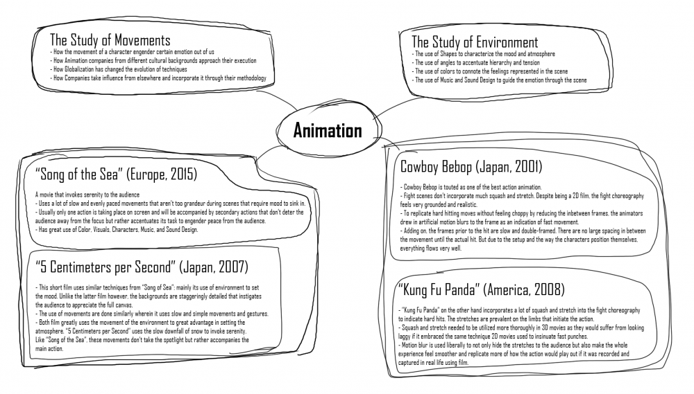 After listening to both the Monday and Thursday lecture, I went through a few of my works to see what genuinely interested me that I could take a step further. Thanks to the mind map exercise given to us on Thursday, I landed upon further researching the study of movements and how different animation studios from different cultural backgrounds may tackle a certain theme using their own methodology. I wanted to see if there were any similarities, differences, or if they’ve influenced one another. Furthermore, I wanted to delve even deeper to see if the time period or globalization may have had any lasting effect on the presentation.
