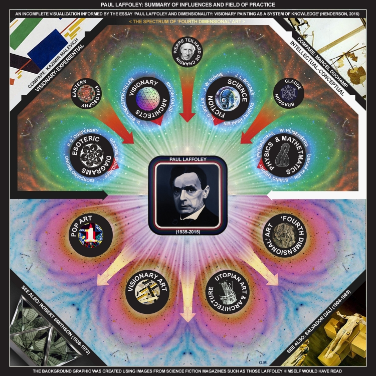 In terms of placing his works within an art tradition, I drew heavily from Linda Dalrymple Henderson's essay 'Paul Laffoley and Dimensionality: Visionary Painting as a System of Knowledge' (2016) which invited comparisons to the Suprematist Kazimir Malevich, to Dalí, Duchamp and to Robert Smithson, a contemporary of Laffoley's.