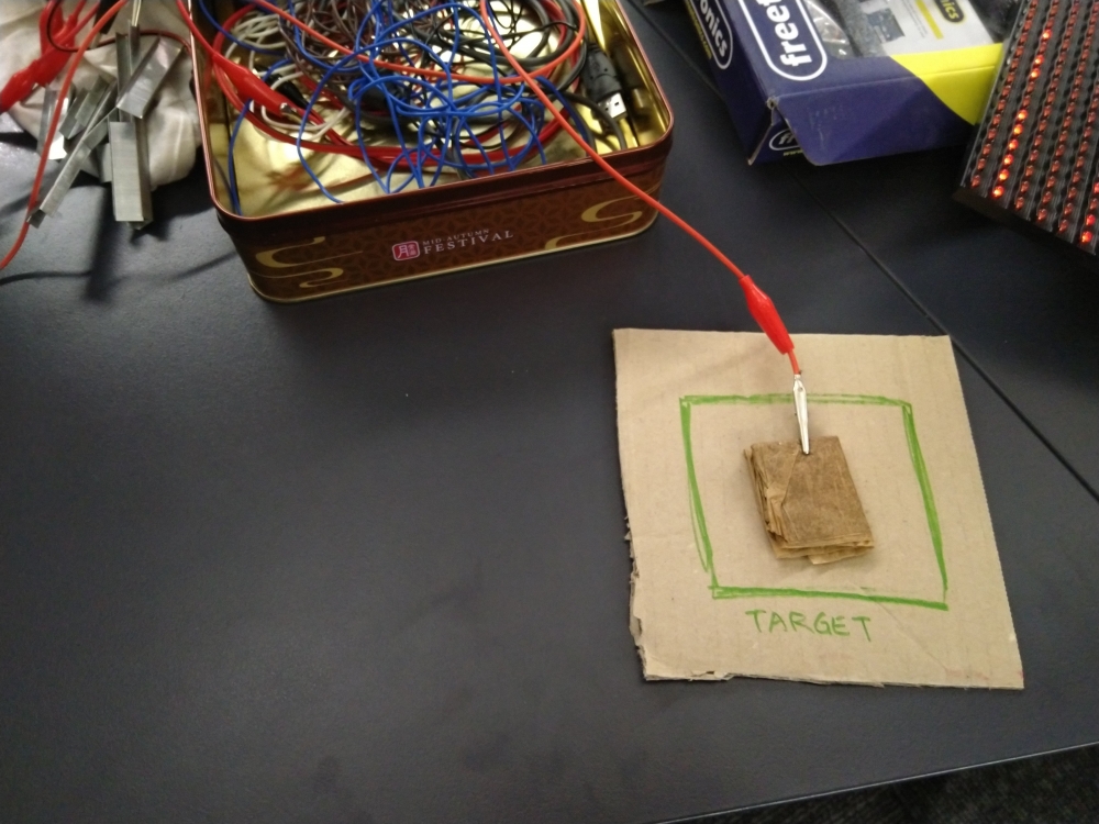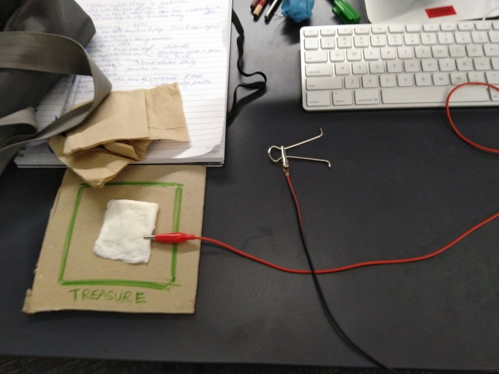 As I was playing the piano using various materials, I found it quite annoying having to hold onto the Earth with one hand while playing the instrument with the other hand. So reconfigured the set up so that the "mallet" used to hit the "piano notes" connected to the ground instead. Seeing the metal mallet resting on the wet tissue and constantly playing the piano C key gave me an idea - what if I designed a game around connection and disconnection, and the player has to keep things constantly connected as a goal?