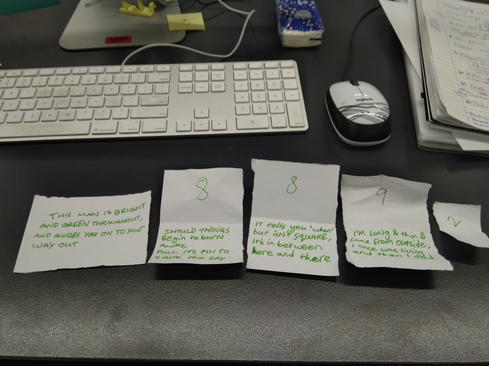 Our first step was deciding on which four objects in the MAGI studio we could use to form our riddles. With the help of a rhyming dictionary and looking at other riddle examples online, we came up with the following four objects and their corresponding riddles: