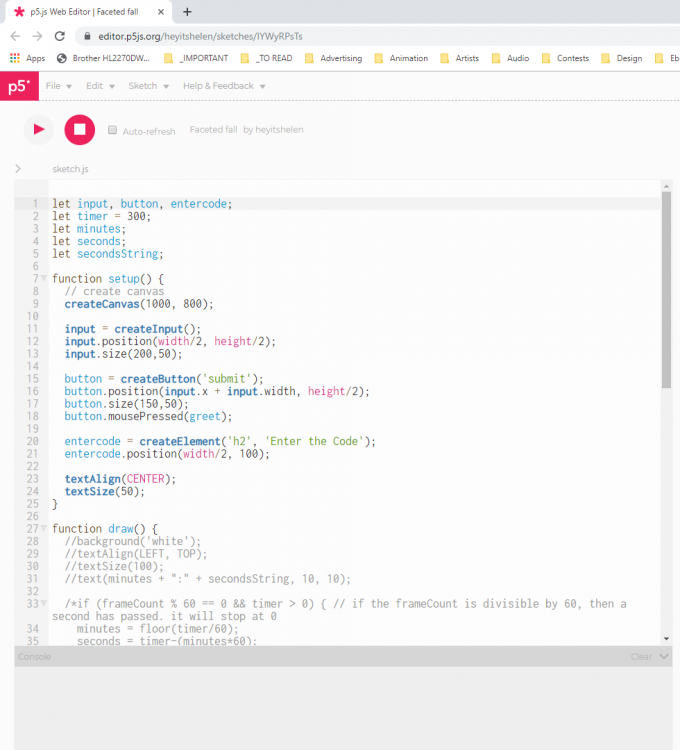 We then attached a number to each riddle - when all the riddles are solved, the four numbers put together will form a code that will stop the bomb. While Emmett was writing out the riddles and secretly placing them on the objects, Helen jumped into p5js.org to create the 'bomb' interface - a simple input field that allowed players to input the secret code, and a submit button that tested for success and fail states. Helen then tried to add a timer to the interface, but it ended up breaking the game; as we were pressed for time, we decided to just load a timer in a separate window instead.
