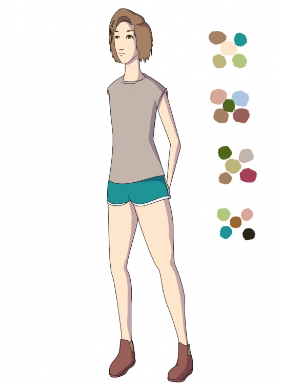 I have to refine/tidy up each of the backgrounds and work on the character/object animations. I've designed a character template with flat colours and shading to use as a reference for the character in each gif