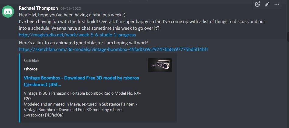 Have been having weekly catch ups with Hizi over Discord (msgs in between) and we've been looking at the Unity project and discussing/making changes as we go.