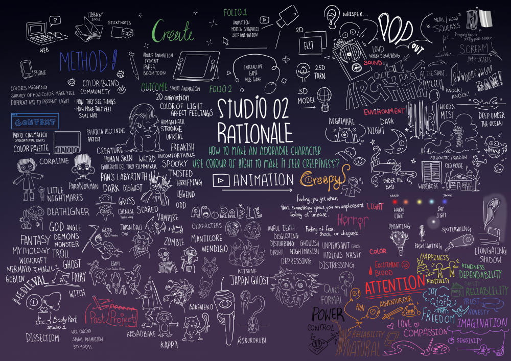 I am making a short animation with an adorable character present it creepiness feeling by exploring the colour of light.