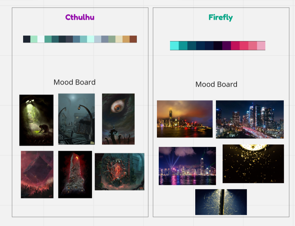 Our group had two stories that we could use. And since I was responsible for the art part in this group, I created a color palette and moodboard for both stories. While doing these, I tried to make things that reflect those worlds as much as possible. For example, the first story was set in the ctulthu universe, so the color palette mostly using green. The other story, Firefly, on the other hand, is much more colorful and contains imaginary environments. That's why I tried to create Firefly's color palatte with more vivid and different tones. After our consoltation seasions, we were told to somehow combine the two stories, which of course changed our approach to the game. I made a new moodboard for the game.