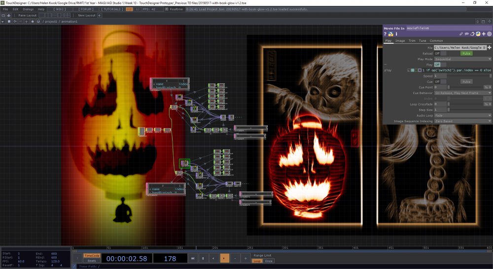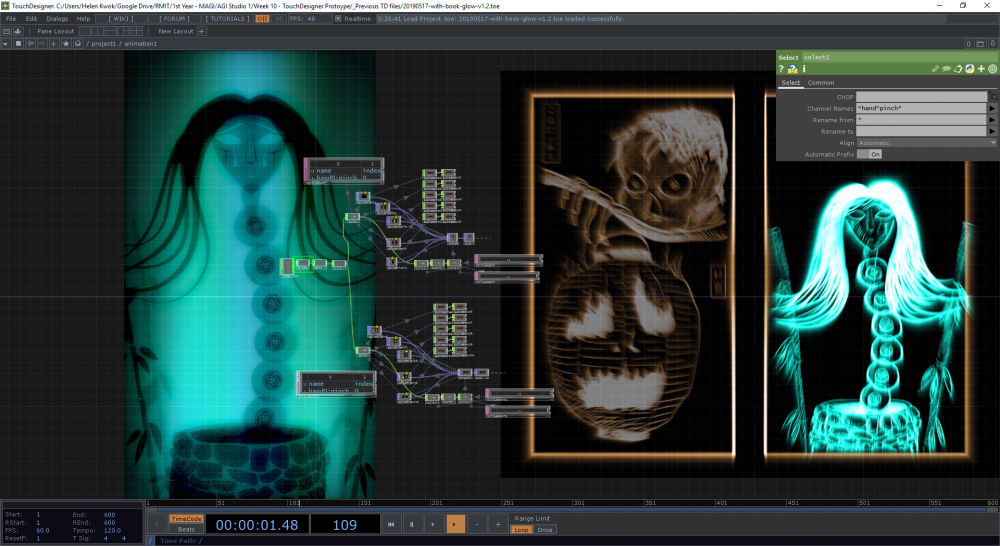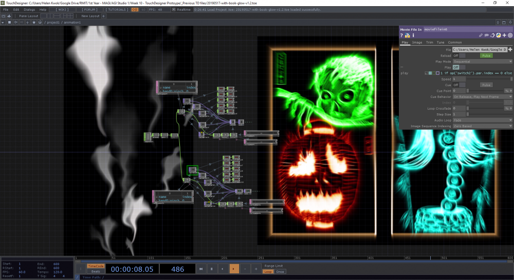 Testing two sets of animations within TouchDesigner - the wall projection featuring the ghost stories, and the book glowing according to which ghost story is featured. Both sets of animations are synchronised to the Leap Motion tracking device.