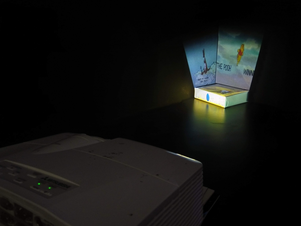 A quick test of the free software VPT (Video Projection Tool), a basic, real-time projection mapping tool. The idea was to project something onto a book (the white box for the time being). Videos were some Winnie the Pooh footage I got off YouTube to test the software. The videos on the wall were pretty clear, but the video on the top of the box was quite blurry due to the angle of the projection. Will have to play around with the angle of the projector. Wanted to set up a video trigger so that the projection only played when motion was detected, but I had trouble getting that to work in the software (the instructions in the online tutorial weren't very clear).