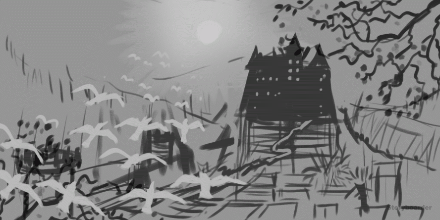 These sketches examine ideas of time can be mutable and elastic through a weekly premise " birds are scattering on the sky in a slow speed, while the pale Sun goes down in one second and the bloody Moon rises." By setting up normal movement on the flying birds to the Dracula castle in Romania but a fast-motion changing sky, I am able to depict a distorted time scale through mise-en-scene, which demonstrates it was the turning point that a human turned into a vampire. This work is similar to the film Matrix, in which the director demonstrates the main characters' agile action through high-speed shots while they are shooting each other. By examining Satoshi Kon - Editing Space & Time and his several animation films, I reflected that ideas of editing time and space in my work could be tangible and meaningful with variable techniques, such as graphic matching and intercutting two different periods, which mirror each other.