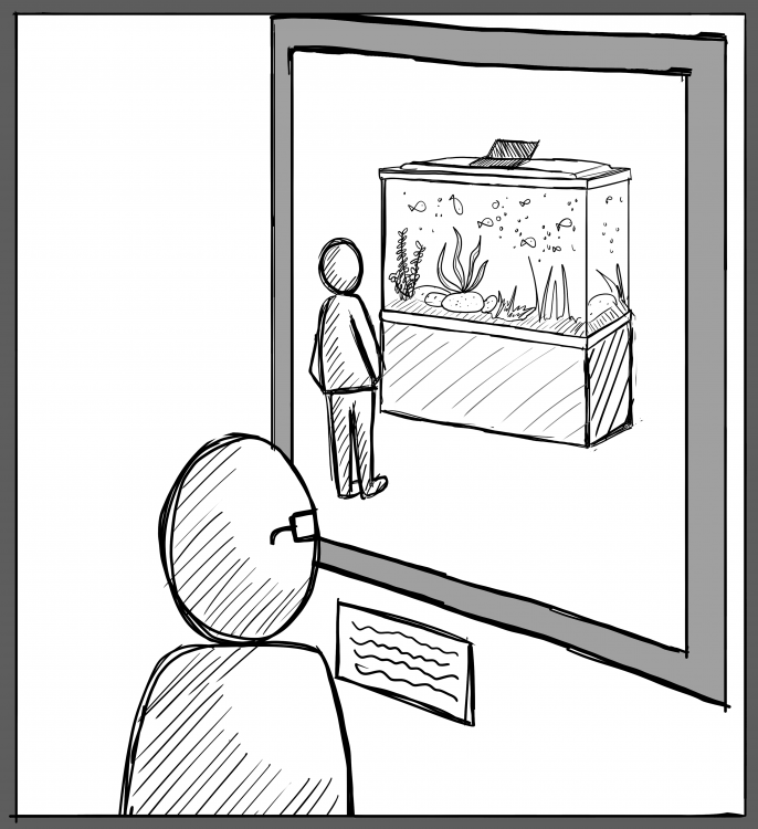 I made a quick sketch of a guy looking at a fish tank where he is thinking this exact thought, not realizing he himself is part of a portrait that he is unaware of as he is being observed by something else. The man in the foreground is then being watched over by us. This was also inspired by a painting Chris showed of a man being part of a painting he was observing.