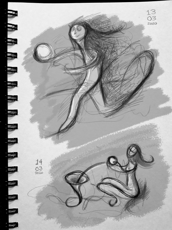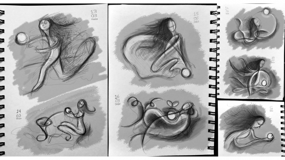 Started off as quick scribbles which then transformed into more detailed pencil sketches. Then scanned into Photoshop to add form and shading via digital painting.